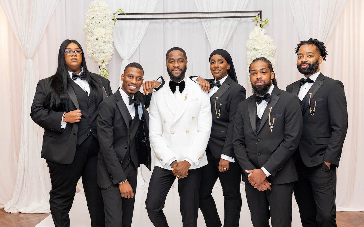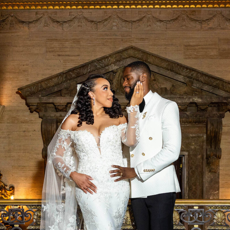 Jeff worked with Brian Alexander to create his wedding style. He had a custom tux with a beautiful white quilted jacket and signature “J” lapel pin. I had two wedding looks. I worked with a boutique wedding dress shop, Irini’s Originals, for my first dress. The base of the dress was from Demetrios Bride but the custom sleeves, overskirt, and veil were all designed by Niki. The highlight of my gown was the long train that draped over the winding staircase at the venue. My reception dress was created by an international dressmaker based in Lagos, Nigeria, called Pearls Bridal.