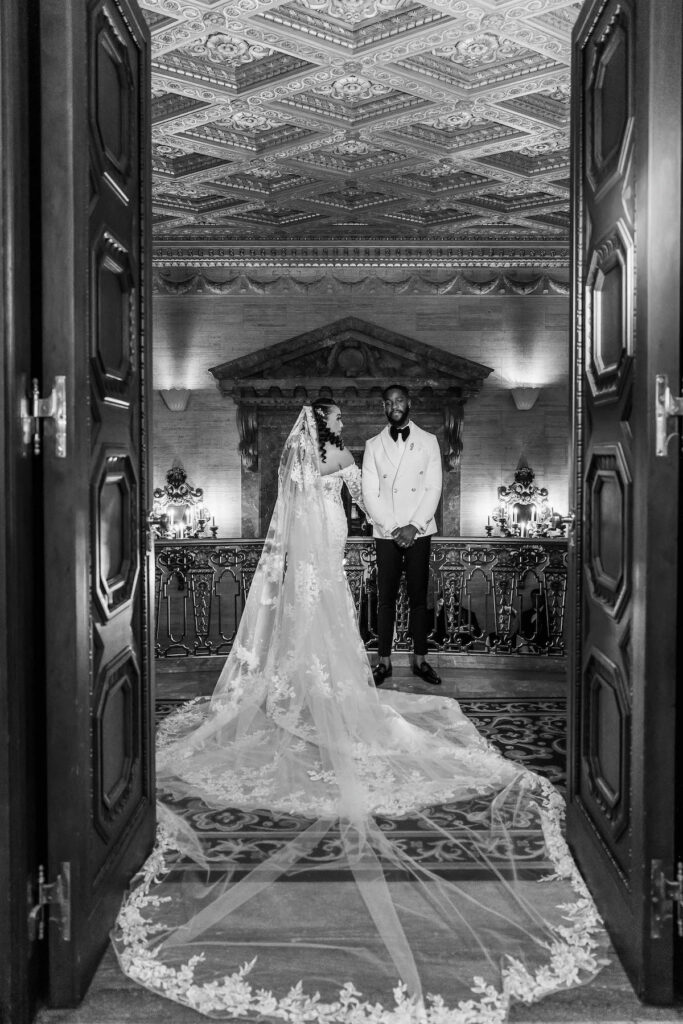 Morgan and Jeff’s luxe black-tie wedding at a baroque style venue boasts romance and royal elegance!