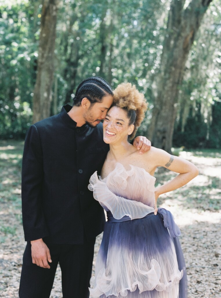 The second equally enchanting bridal look was a ruffled purple and beige dress. Reminiscent of a flower’s petals gently unfurling, the unique style is perfect for brides seeking an elegant, romantic, and whimsical style.