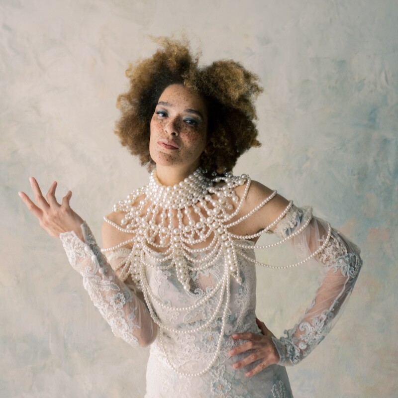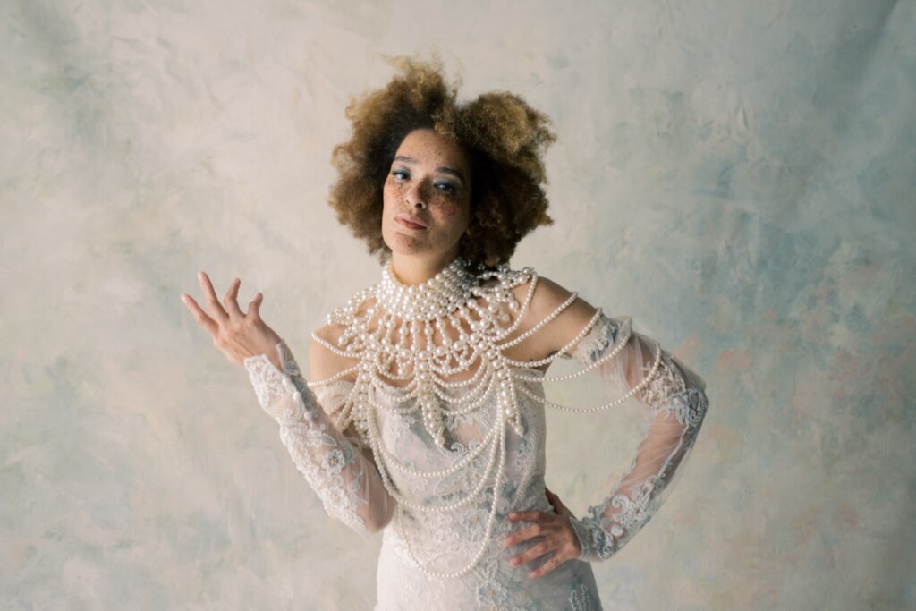 Featuring intricate lace overlay details with delicate blue flowers and sheer sleeves, model Nikia, draped in pearls and styled with her natural hair, exuded the essence of a true bridal goddess.