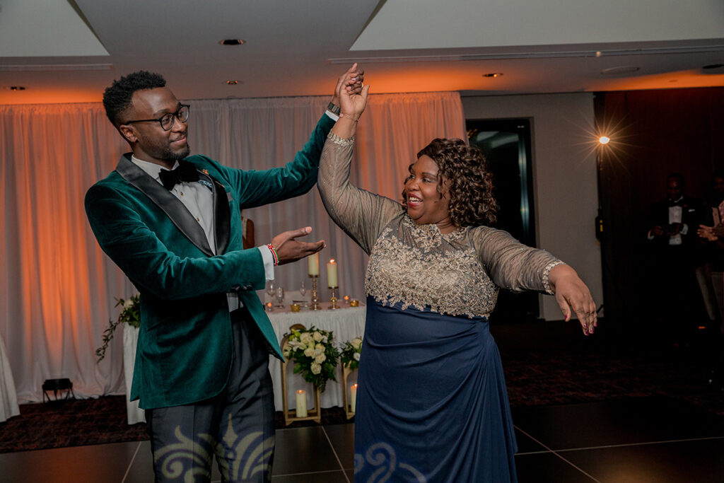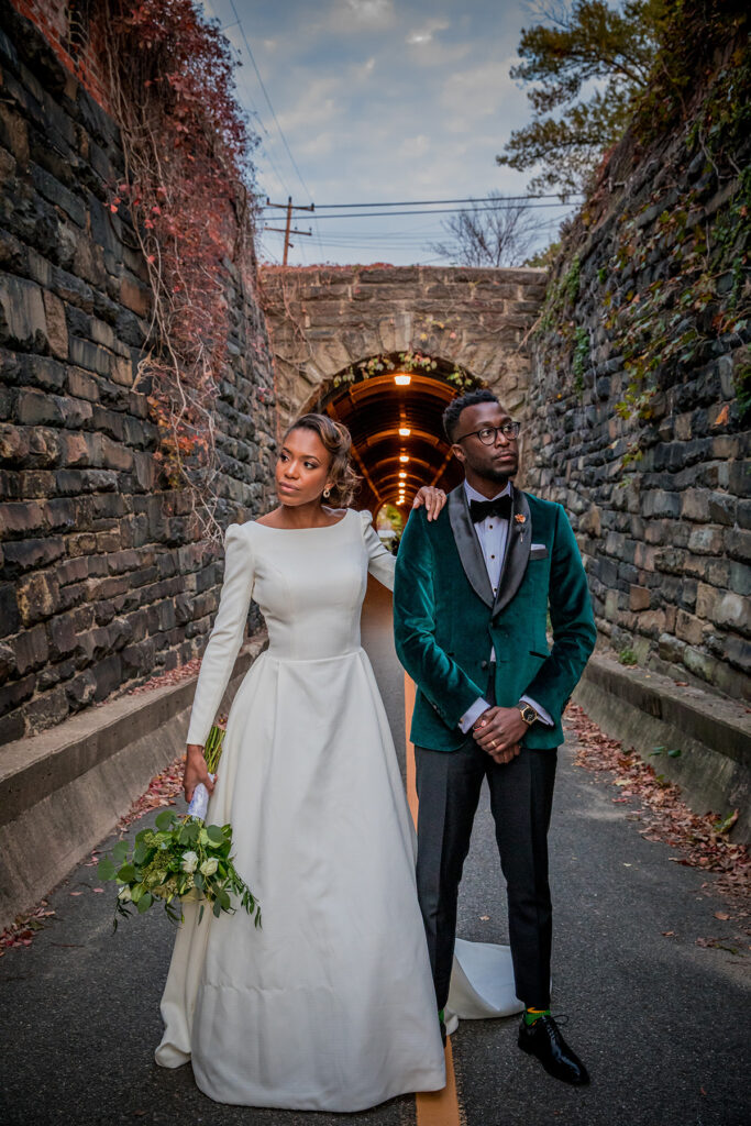 For their beautiful fall nuptials, these college sweethearts chose a regal color palette consisting of Ivory, Emerald, and Gold. Their wedding planner, MunaLuchi Coterie member Ashley Merisier of A. Merisier Event Coordination & Design shares, “Beautiful floral blooms were displayed throughout their entire wedding day. As a fan of geometric shapes, Whitley wanted this to be featured via her reception tables which provided a minimal mix of ivory floral, sage greenery and a candlelit tablescape with complementary menus and table numbers to match her wedding invitation suite.”