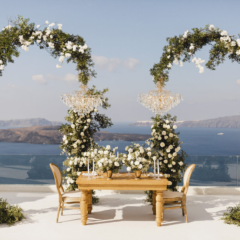 Their acting bride and groom set the scene while posing beneath an arch of green and white florals. Carefully arranged before an azure backdrop, lux place settings of gold tableware, crystal plates, and white candles glimmered in the Santorini sun. A classic wooden table and chairs grounded their design. With every detail considered, the resulting shoot is truly breathtaking.