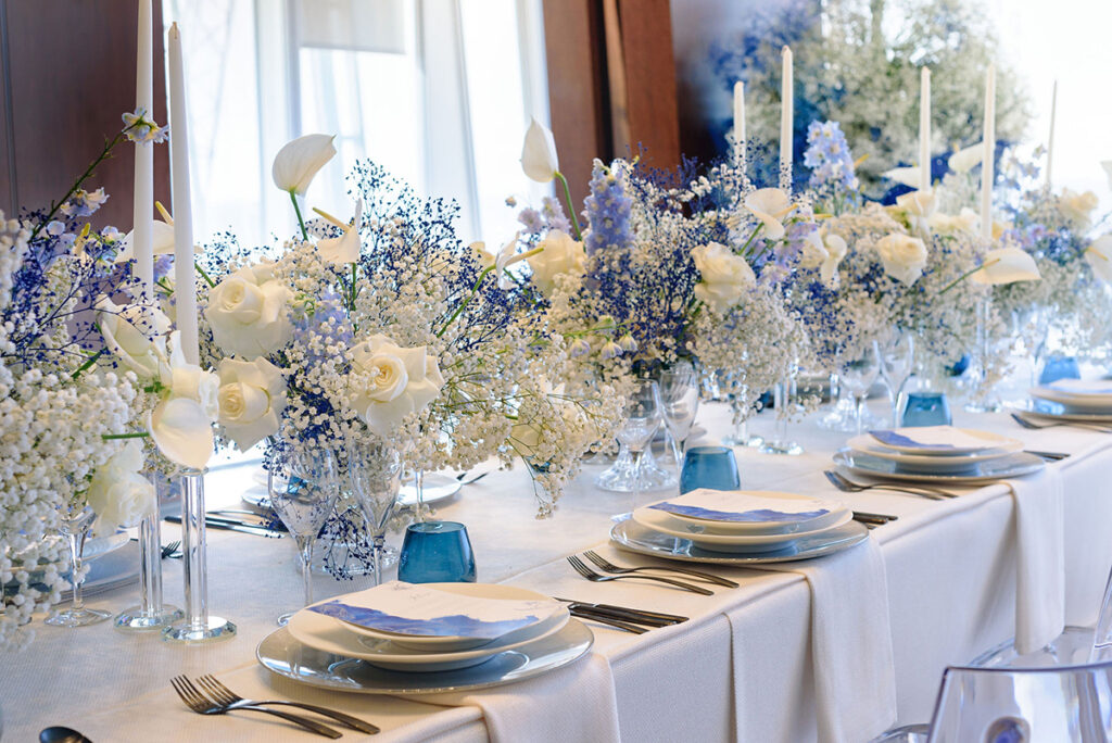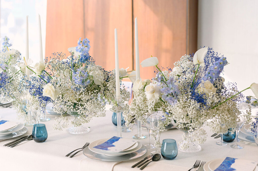 In the small event room, blue and white gypsophila were stylishly designed with anthuriums and other blooms, for a softening yet statement and contemporary effect. The tableware included black cutlery to add some sophistication to the tablescape, and perspex chairs to help keep the setting light against the breath-taking views. The cake and stationery design were kept fresh and modern.