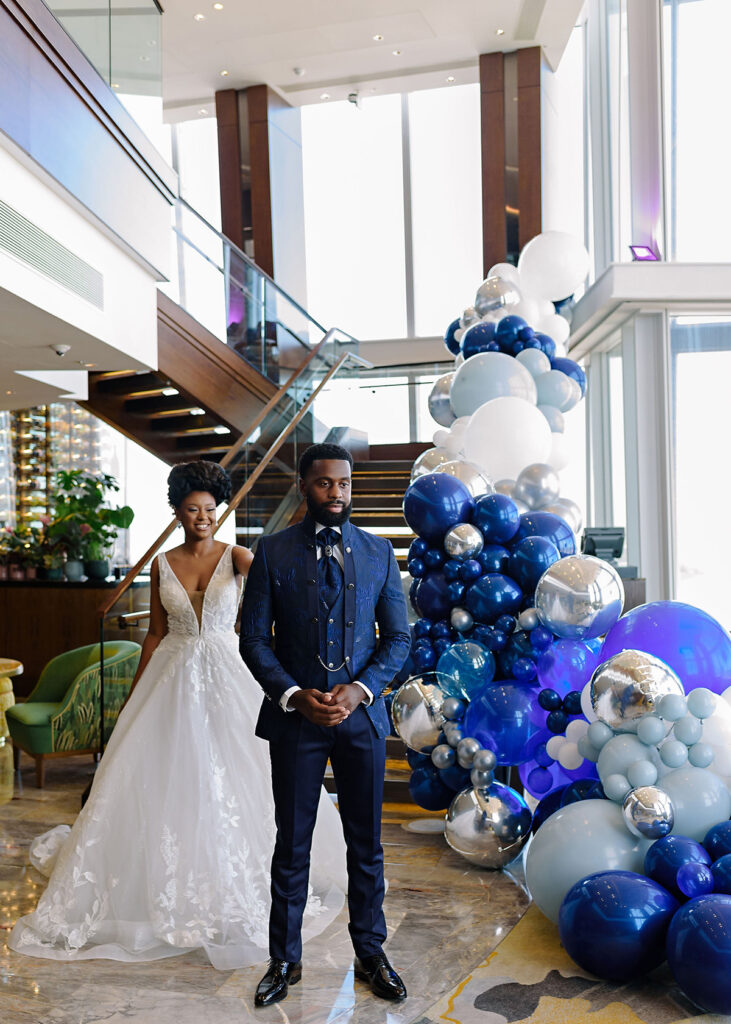 The shoot started off on the grand staircase, which shows a panoramic view of the city; there is nothing quite like a romantic and magical feeling as the bride walks down to meet her groom. The staircase was decorated with over-sized balloon garland to add stylish trend to the overall design.