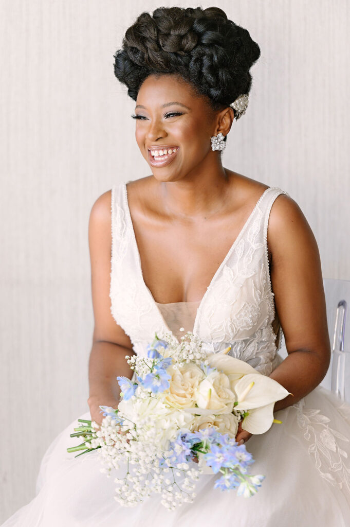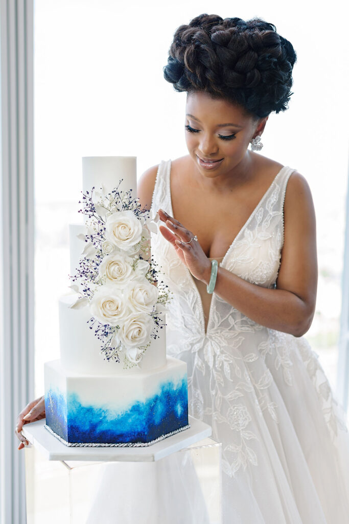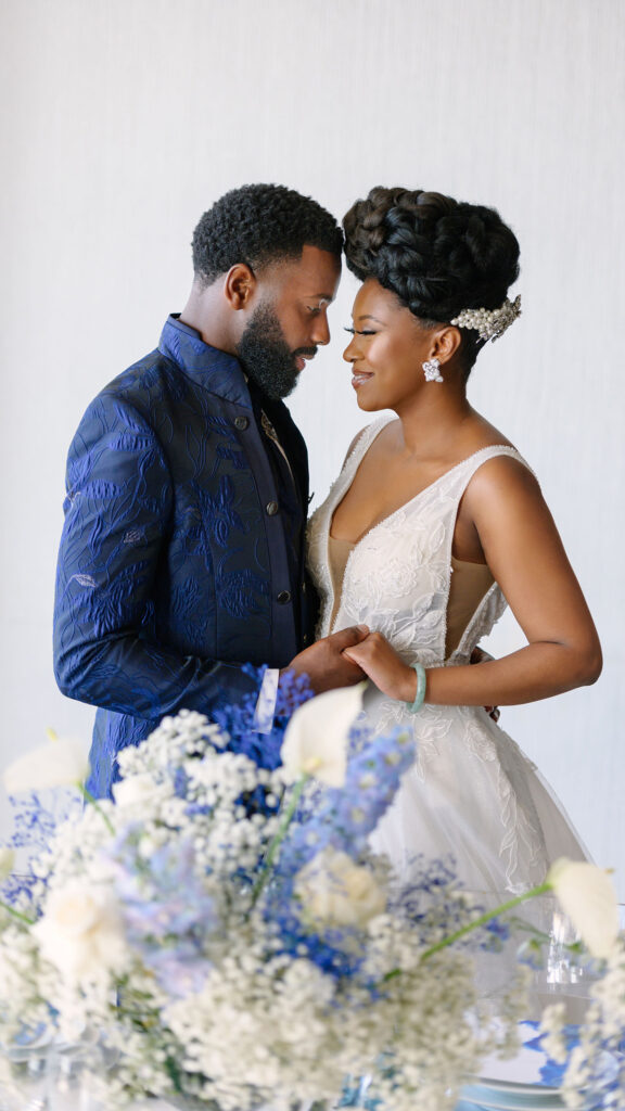 I chose blue as the focal colour, with white and accents of silver and black, as I wanted a bold, yet calm, fresh and stylish palette. The bride wore a stylish Nicole Milano ballgown and a bespoke glamorous blue evening gown by Black British designer, Sarah Boadu, with complementing shoes, jewelry, hair and makeup. I matched the groom’s look with a rich patterned blue suit; a style which is more than the average.