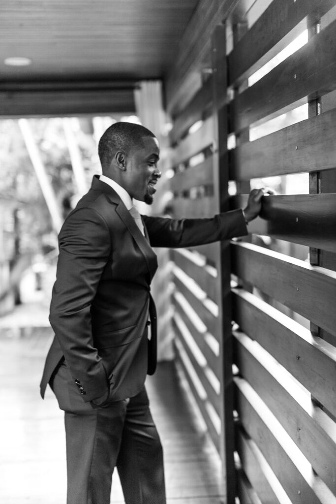 My dress was gorgeous and I fell in love the moment I put it on. It was Ivory with embossed lace, nude undertone, fitted with a sweetheart off the shoulder neckline, cut-outs in the side, and a gorgeous train with tons of detailing, designer – Mark Thornburg. His suit was a beautiful navy blue Ted Baker suit, fitted, light material with a blush pink tie and white dress shirt.