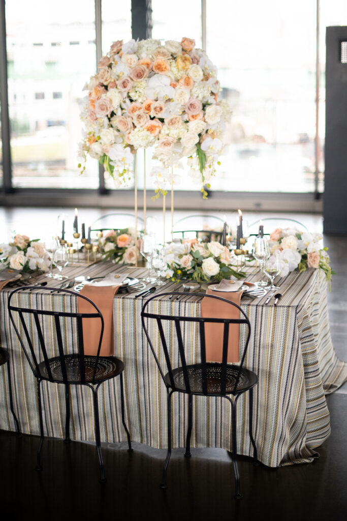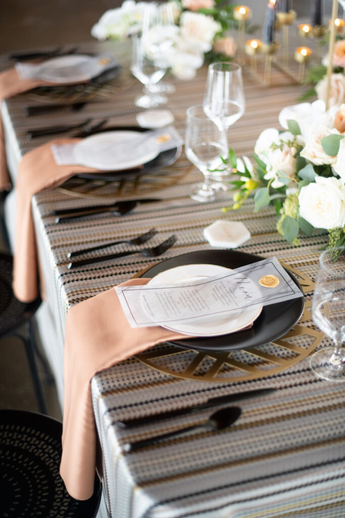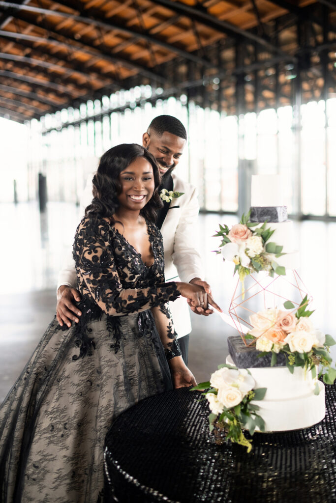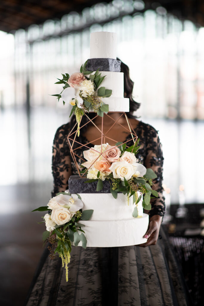 “With a geometric flair and modern glam accents, this styled shoot boasts a modern transformation of the industrial and newly renovated Main Street Station Shed. My initial inspiration came from this AMAZING black dress, the Zander, from Maggie Sottero’s, Sottero and Midgely Collection. I live for a bride that wants to be bold and think outside of the traditional white dress. This dress is full, glamorous, and dramatic as every bride should be on their wedding day.