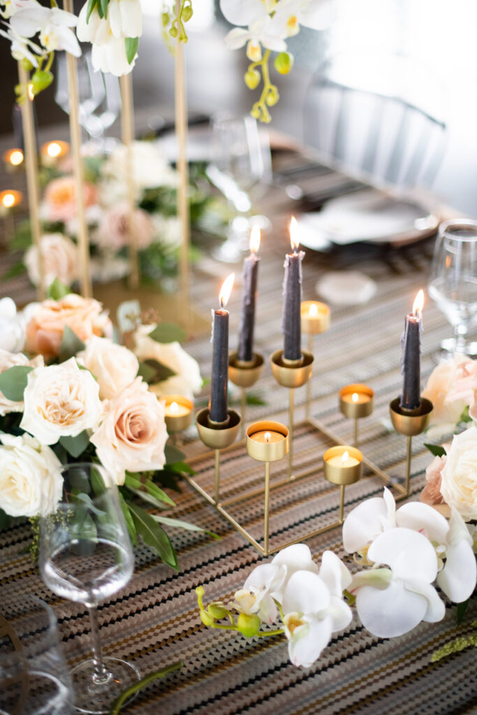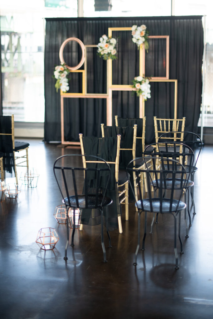 “I chose to use design elements that were geometric to play along with metal beams in the space. From the cake to the chargers, to the lanterns down the aisle, I wanted that to be visible through and through. We paired these geometric elements with lush florals, marble elements, and rich linens.”
