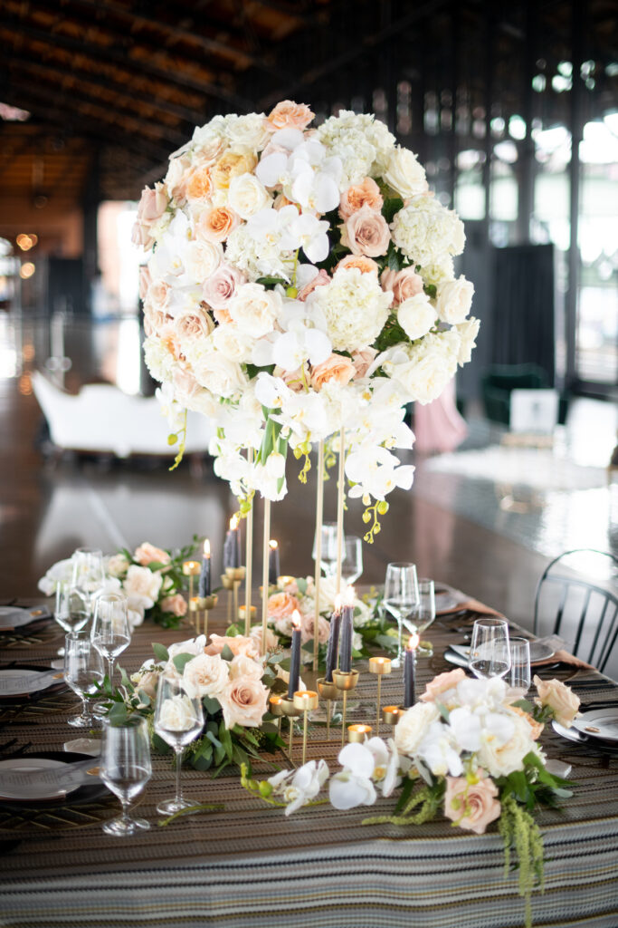 “What inspired me initially to use Main Street Station is because it’s so Richmond and one of the biggest challenges as a Richmond planner is finding a new, exciting place to host weddings that’s interesting. Not interesting because it’s rich in history, Victorian style furniture, or overly traditional, but something that’s interesting from an architectural perspective. I love the idea of working with a clean slate but I wanted to work in this space because of its iron beams rather than the more “rustic” wooden beams I usually see in newer venues. The high ceilings, glass windows, and subtleness of the train going by were perfect accents.