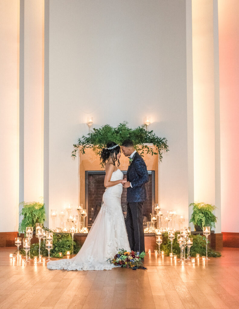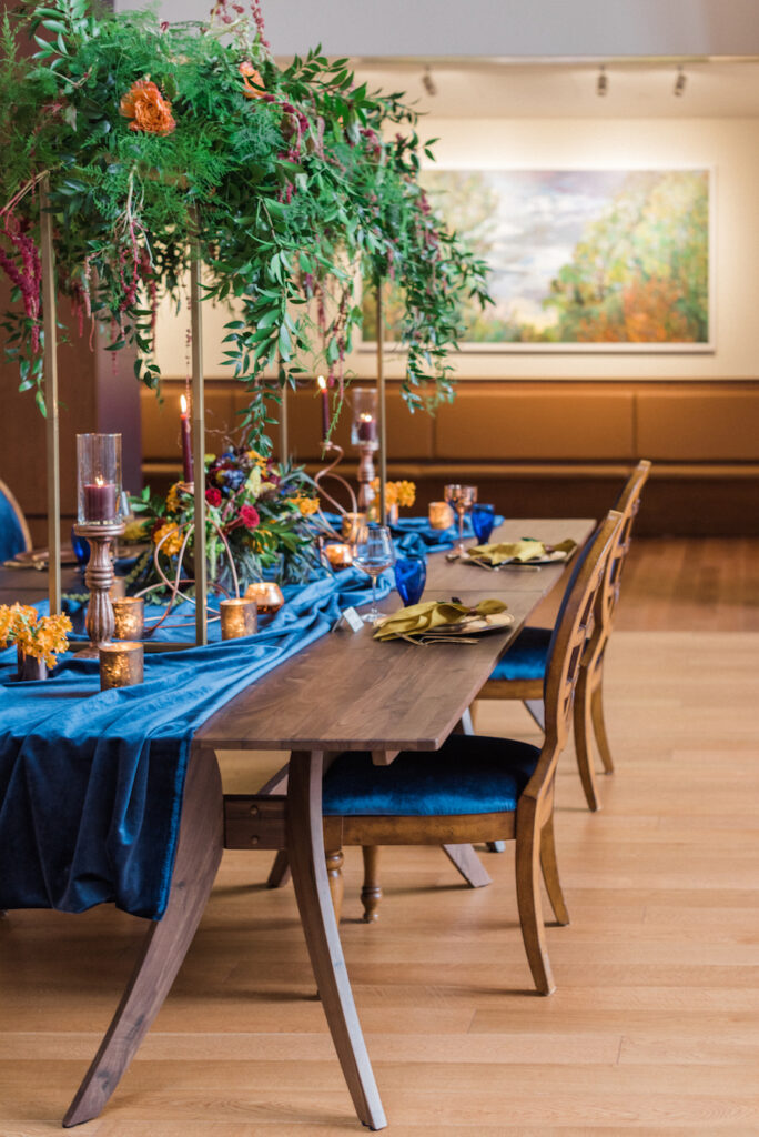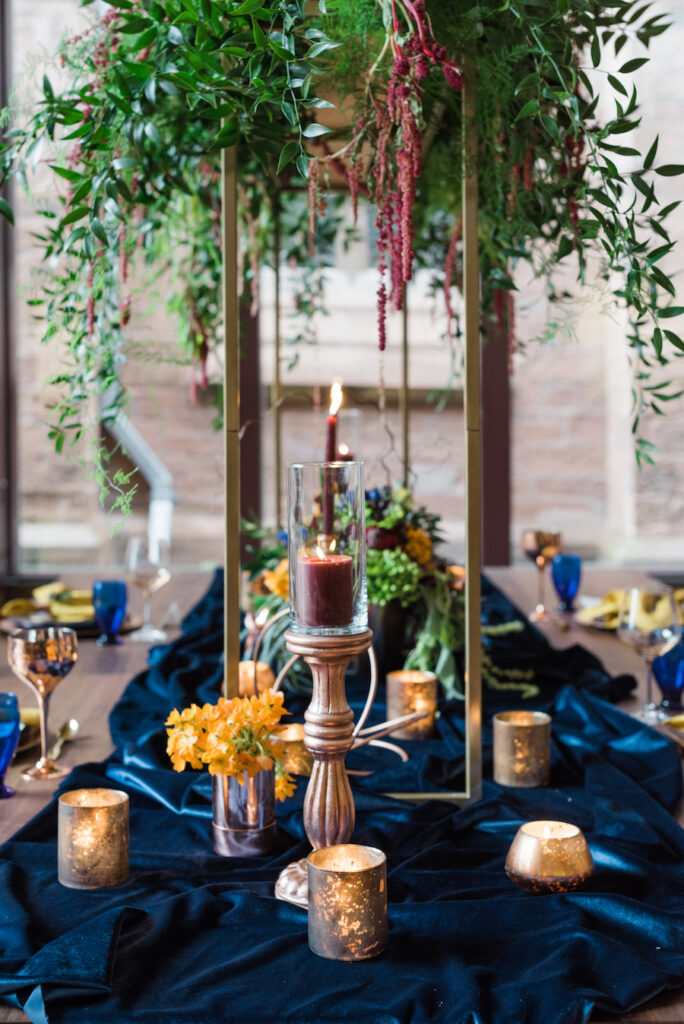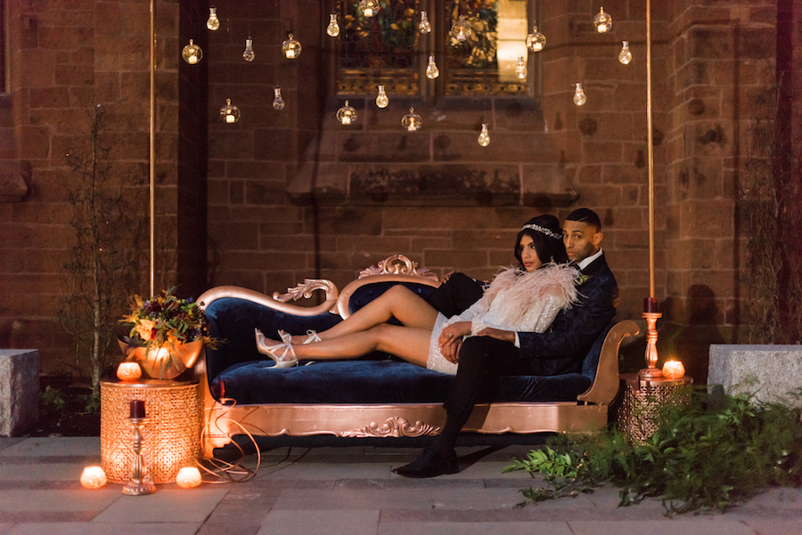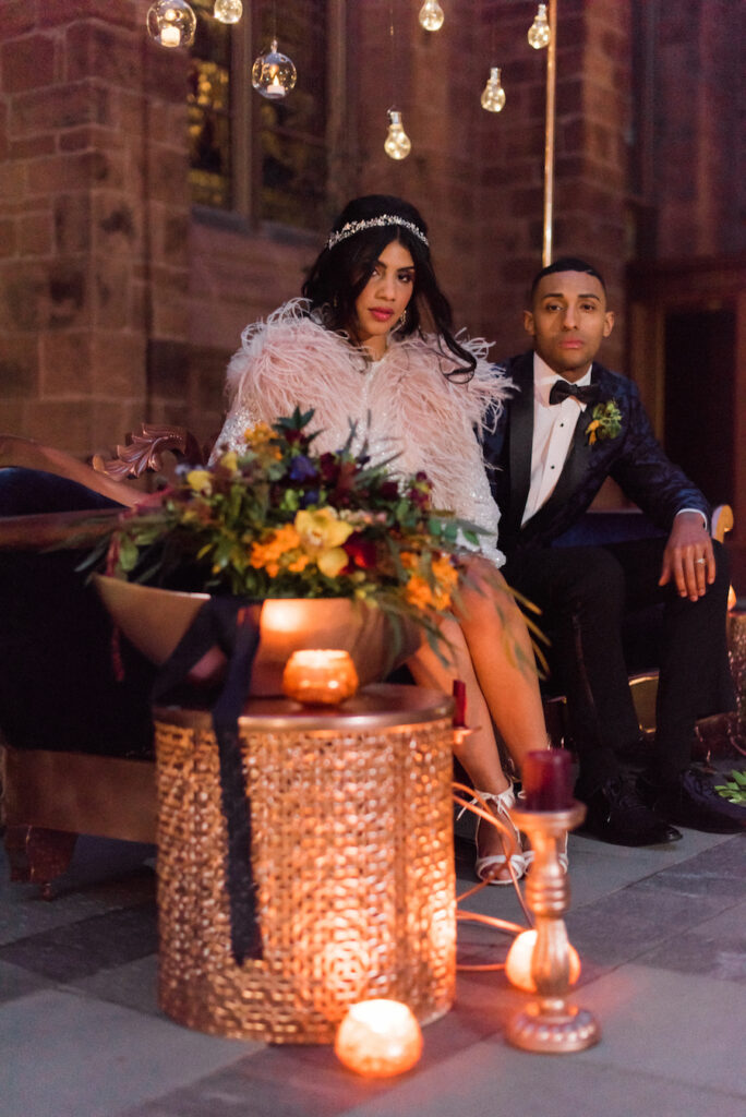 Fall/Winter inspired wedding styled shoot. We chose this alternative venue space adjacent to the historic Grace Cathedral Church, tradition in the heart of progressive artsy Providence RI. Inspired by travel, multi cultural traditions, mixed with a modern day couple along with the downtown city chic vibes. We chose models indicative of multi cultures, Latin and African American decent and designed and played with rich tones and colors, inherent in both the colonial and latin and African cultures. Deep royal hues, in blue, gold, and mustard with pops of red and cranberry and woven with touches of metallic in copper tones too. We also photographed this on med format film but also digital. We hope this will inspire you to pursue alternate spaces, embrace tradition and multi culture and design the wedding of your dreams!